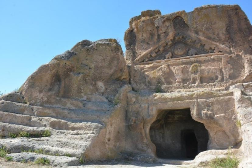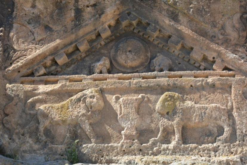 Halk arasında cephesindeki dev aslan kabartmaları nedeniyle "Aslanlı Mabet" olarak bilinen bu yapı, aslında binlerce yıllık bir sentezin ürünü. Temelleri Frig dönemine dayanan mabet, MS 2. yüzyılda Roma döneminde yapılan eklemelerle son halini almış. İki katlı yapısıyla dikkat çeken anıtın alt katı mezar odası, üst katı ise kutsal bir alan olarak tasarlanmış.