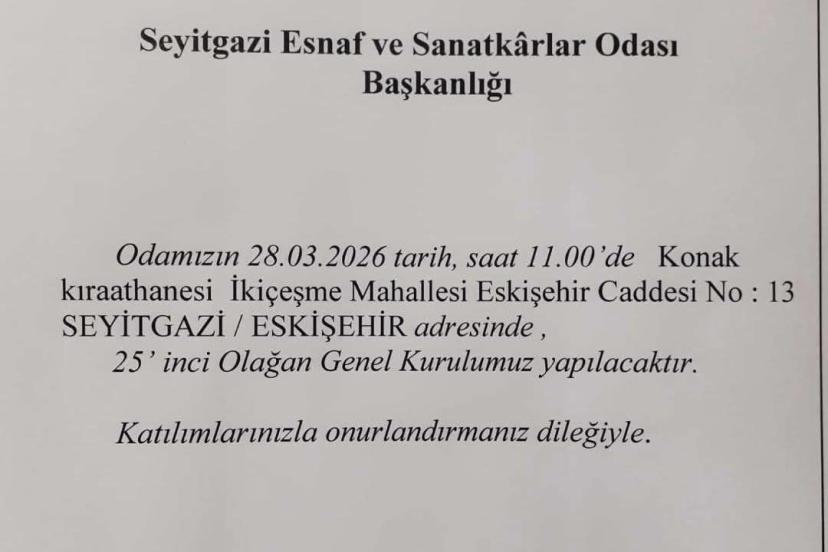 Seyitgazi Esnaf ve Sanatkârlar Odası Başkanı Mahmut Erdal Kalın, yayımlanan bildiriyle tüm oda üyelerini kongreye davet etti. Kalın, duyuruda "25'inci Olağan Genel Kurulumuz yapılacaktır. Katılımlarınızla onurlandırmanız dileğiyle" ifadelerini kullanarak, esnafın birlik ve beraberlik içerisinde sandığa gitmesinin önemine vurgu yaptı.